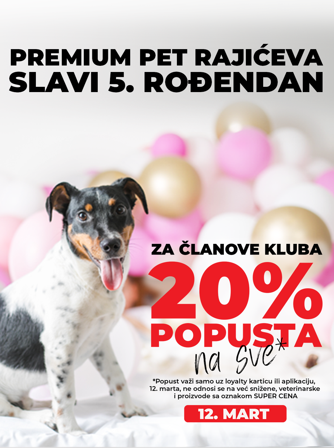 *20% popusta iskoristi uz loyalty karticu ili aplikaciju, samo 12. marta, samo u Premium Pet Rajićeva, na SVE osim na već snižene, veterinarske i proizvode sa oznakom SUPER CENA.